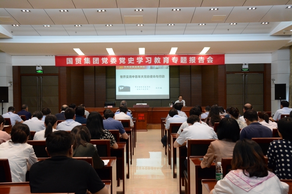 為慶祝中國共產黨成立100周年,進一步推動黨史學習教育走深走實,6月10日,國貿集團黨委舉辦黨史學習教育專題報告會,邀請省委講師團專家、省委黨校馬克思主義學院院長汪興福教授作專題授課。集團領導、各成員企業班子成員、各黨支部書記和部分黨員代表共約100人聆聽了報告會。
